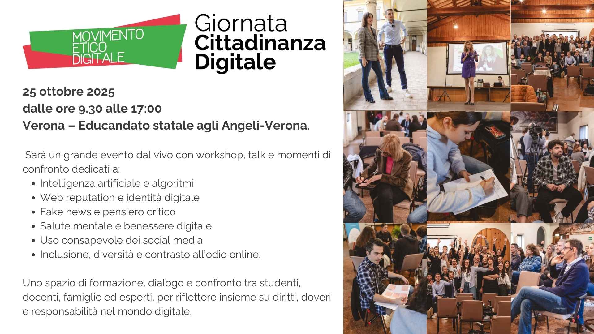 - Attività interattive, testimonianze, workshop, laboratori